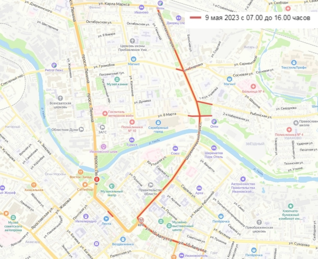 Кроме того 9 мая 2023 года не менее чем до 24.00 часов будет организовано движение муниципальных и межмуниципальных автобусных маршрутов регулярных перевозок по территории г. Иваново для обеспечения перевозки пассажиров после окончания праздничных мероприятий и проведения пиротехнического шоу (фейерверка) из мест массового скопления людей (от площади Победы, площади Революции, с улиц Кузнецова и Демидова).
