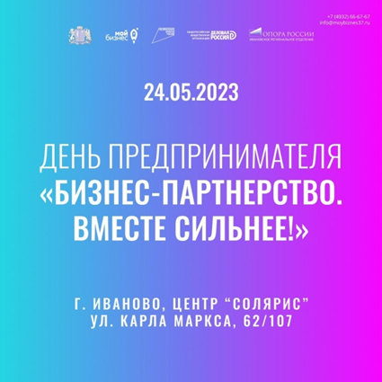 Ищете пути развития своего бизнеса? А вы знаете, что бизнес-партнерство является одним из способов взаимовыгодного сотрудничества, позволяющего бизнесу развиваться, получать новые заказы и увеличивать прибыль? На областном форуме «День предпринимателя», который в этом году пройдет под лозунгом «Бизнес-партнерство. Вместе сильнее», вы узнаете все о бизнес-коллаборациях 24 мая в центре «Солярис» (г. Иваново, ул. Карла Маркса, 62/107). Торжественное открытие – 11.00, регистрация стартует в 10.30. Это не только образовательное мероприятие, но и площадка для плодотворного общения, где вы сможете вдохновиться идеями, познакомиться с единомышленниками и найти бизнес-партнеров. Узнать полную программу и зарегистрироваться можно по ссылке https://дп.мойбизнес37.рф Форум проводится при поддержке правительства Ивановской области, Ивановского регионального отделения ОПОРЫ РОССИИ, и Деловой России Ивановской области Дополнительные подробности можно узнать у специалистов центра «Мой бизнес» по телефону +7 (4932) 66-67-67.