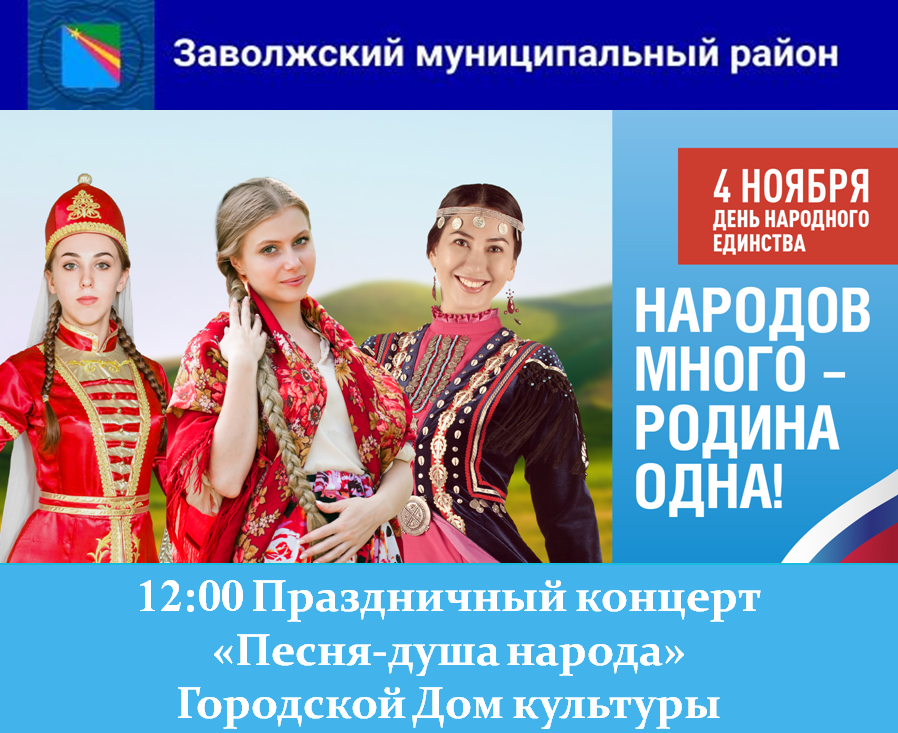 В праздник народного единства приглашаем вас к 12:00 в городской Дом культуры на праздничный концерт «Песня- душа народа». Цена билета: 100 рублей.
