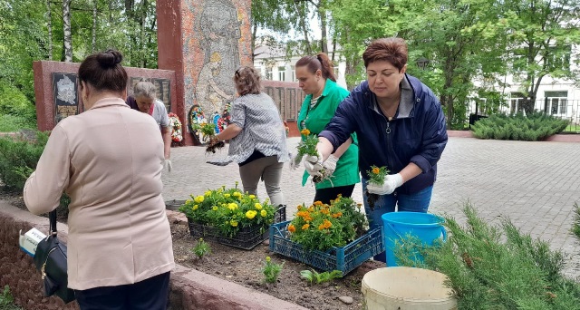 Участники субботника привели в порядок клумбы и посадили цветы.