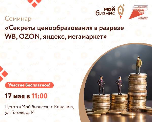 Центр «Мой бизнес» приглашает предпринимателей, физических лиц и самозанятых граждан Кинешемского и близлежащих муниципальных районов на семинар «Секреты ценообразования в разрезе WB, OZON, Яндекс Маркет, Мегамаркет».
