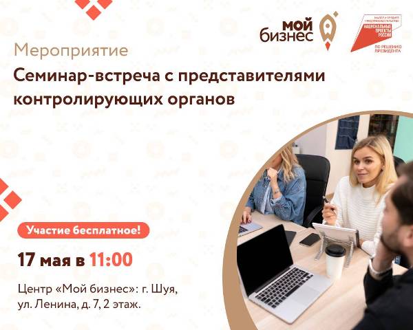 Центр «Мой бизнес» приглашает предпринимателей и самозанятых граждан г.о. Шуя, Шуйского и близлежащих муниципальных районов, а также физических лиц, планирующих начать предпринимательскую деятельность, на бесплатный семинар-встречу с представителями контролирующих органов.