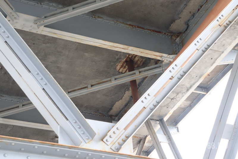Эта проблема, считайте, идёт плюсом к проблеме с защитным покрытием металлических конструкций. Посла капитального ремонта, окончание которого пришлось на 2018 год, конструкции стремительно облупились, вслед за чем подрядчик (подмосковная компания «НПП СК МОСТ») покрасил их заново и получилось всё точно то же самое. Краска снова облупилась , отчего металл ржавеет, ржавеет, ржавеет… Что сверху, что снизу моста.