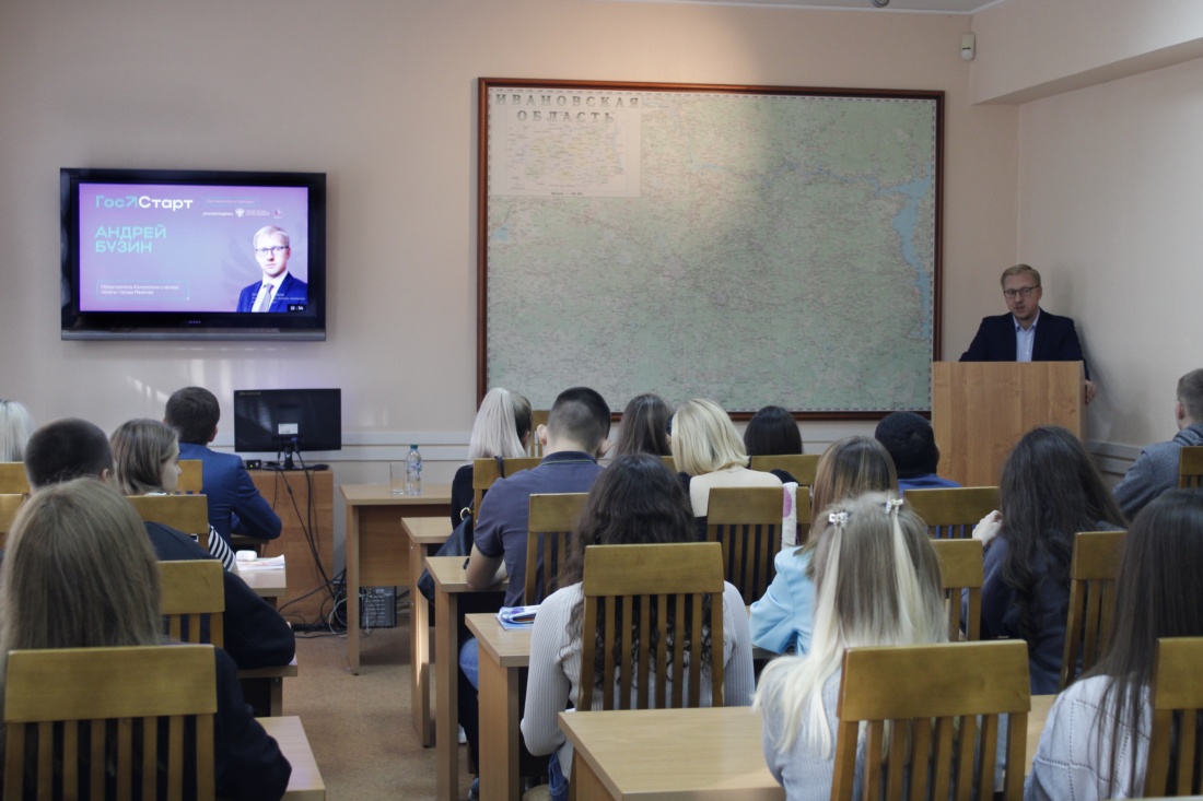 На площадке Ивановского филиала Президентской Академии 27 сентября состоялась встреча председателя Контрольно-счетной палаты города Иванова Андрея Бузина со студенческой молодежью в рамках проекта «ГосСтарт.Диалог».