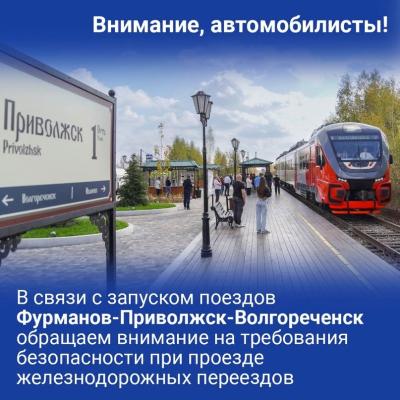 В связи с началом курсирования поездов по новой железнодорожной ветке Фурманов - Приволжск - Волгореченск обращаем внимание водителей на необходимость соблюдать правила дорожного движения на железнодорожных переездах.