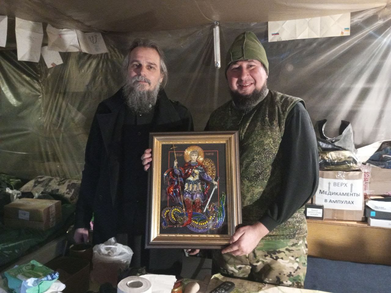 В эту поездку настоятель храма протоиерей Петр Влащенко смог побывать на передовой, пообщаться с бойцами, освятить помещение штаба. В дар от донбасской земли бойцы подразделения передали иконы из разрушенного в ходе боевых действий храма. А от группы кинешемских добровольцев передана вышитая бисером икона Георгия Победоносца.