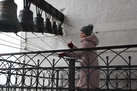 Начинающих звонарей сменила на звоннице инокиня Антонина (Гаврилова) из Введенского женского монастыря. Резкие порывы ветра развевали черные монашеские одежды. Казалось, что монахиня борется со стихией. И мелодия звона была иная, пронзительно-сильная.
