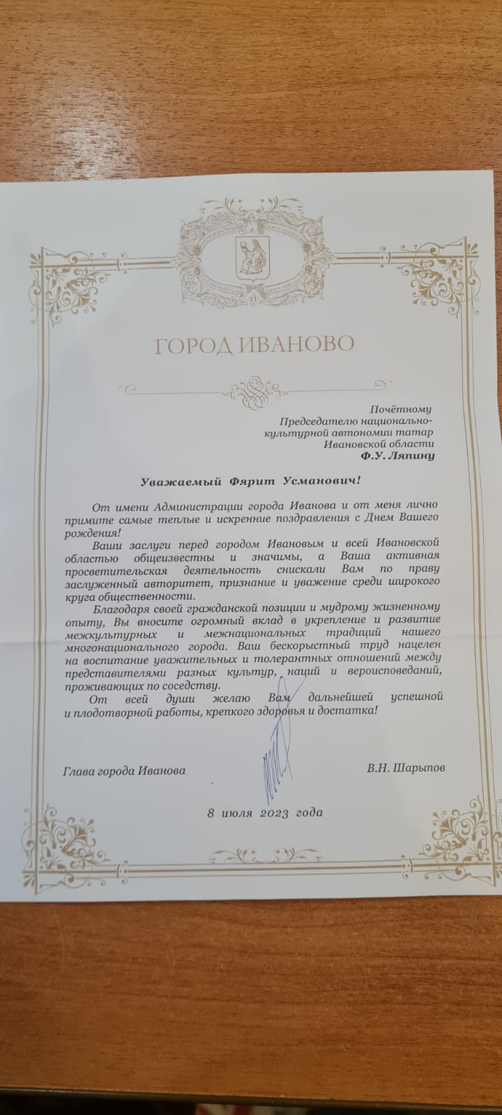 Пожелания здоровья, успехов в плодотворной деятельности на благо Ивановской области во имя межконфессионального и межнационального сотрудничества, укрепления общественного согласия и единения на благо Родины поступили от Главы города Иваново Владимира Николаевича Шарыпова, председателя Ивановской городской Думы А.С. Кузьмичева, председателя Ивановской городской организации ветеранов Н.И. Быстрова, депутата Ивановской городской Думы главного врача ОБУЗ «Ивановский областной онкологический диспансер» Владимира Александровича Козлова, руководителя Исполнительного комитета Тетюшского муниципального района Альберта Асхатовича Гасимова, главы Тетюшского муниципального района Рамиса Хатыповича Сафиуллова.Управления общественных связей и информации Администрации города Иваново и других.