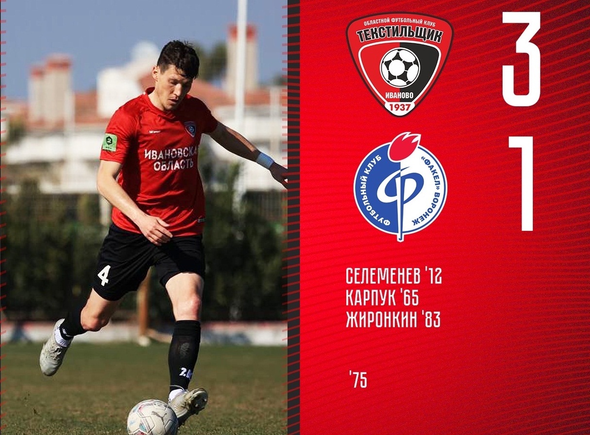 Ивановский футбольный клуб "Текстильщик" обыграл "Факел-Воронеж" в Сочи. Матч закончился со счетом 3:1. Победные голы забили Иван Селеменев, Илья Карпук и Виталий Жиронкин.
