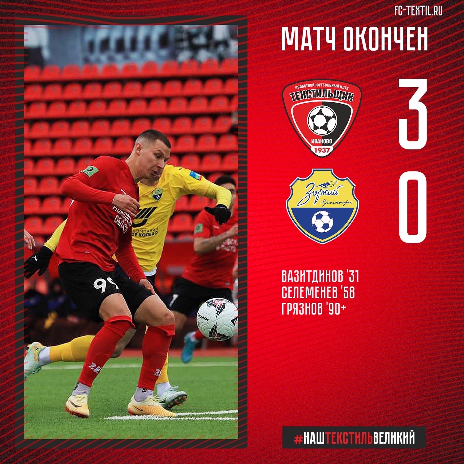 "Текстильщик" одержал уверенную победу в первом матче нового сезона. Наши футболисты оказались сильнее команды "Зоркий" из Красногорска. Игра проходила на домашнем стадионе "Текстильщика" в Иванове. Итоговый счет - 3:0 в пользу хозяев.