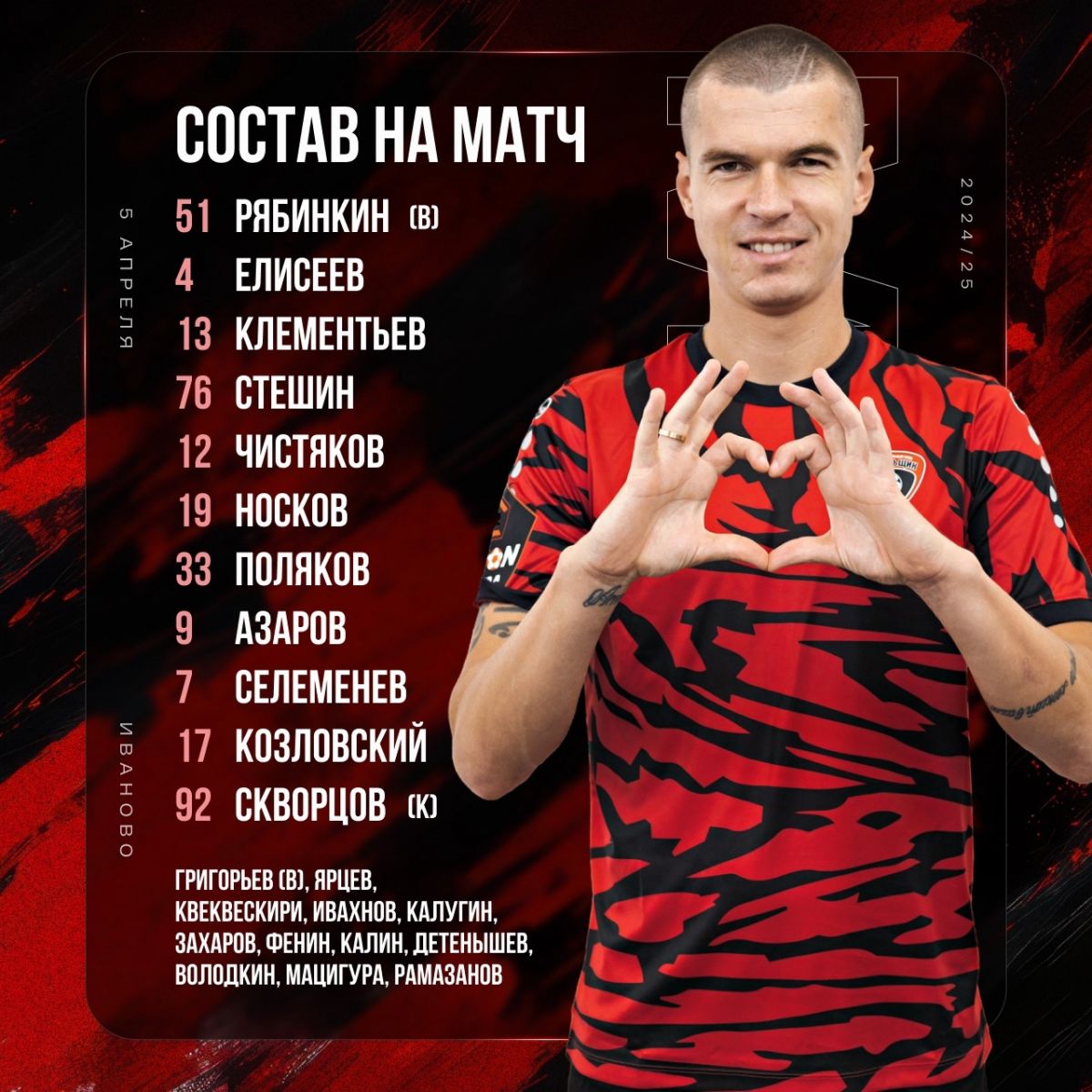 Рябинкин, Елисеев, Клементьев, Стешин, Чистяков, Носков, Поляков, Азаров, Селеменев, Козловский, Скворцов.