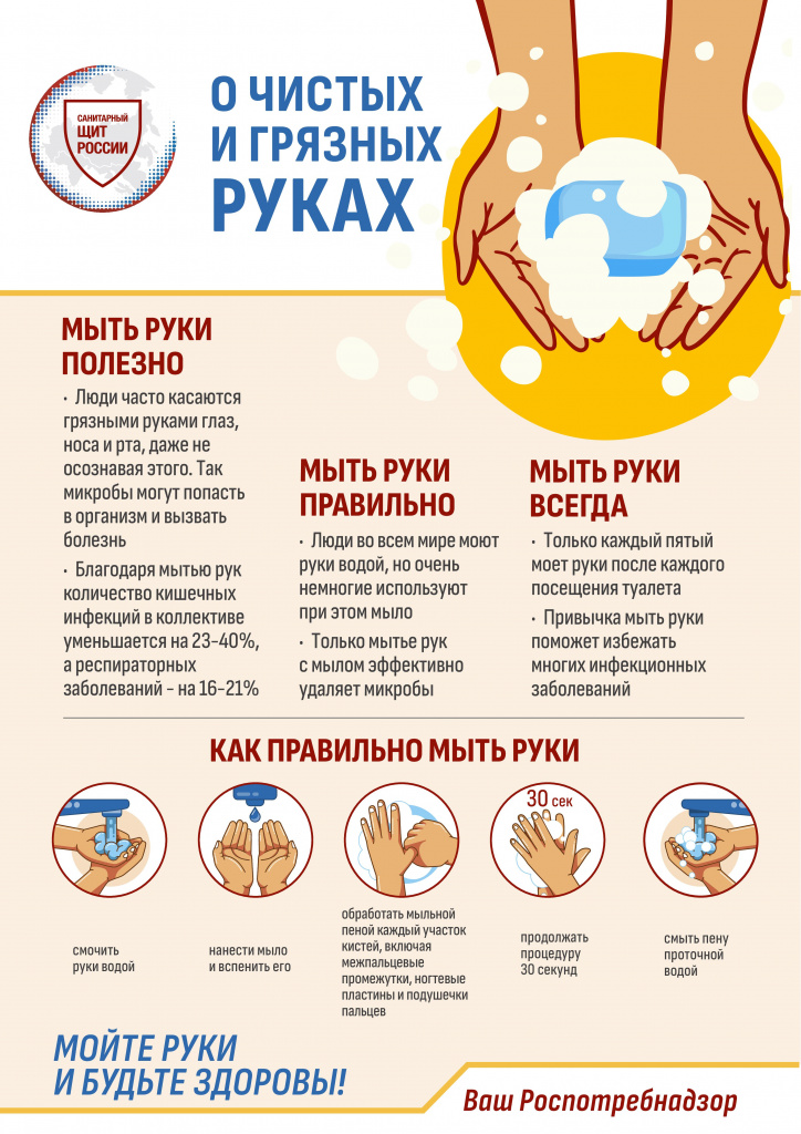 Тщательное мытьё рук с мылом или их обработка спиртовым антисептиком в течение 20-30 секунд способны значительно снизить передачу инфекций контактно-бытовым путем.