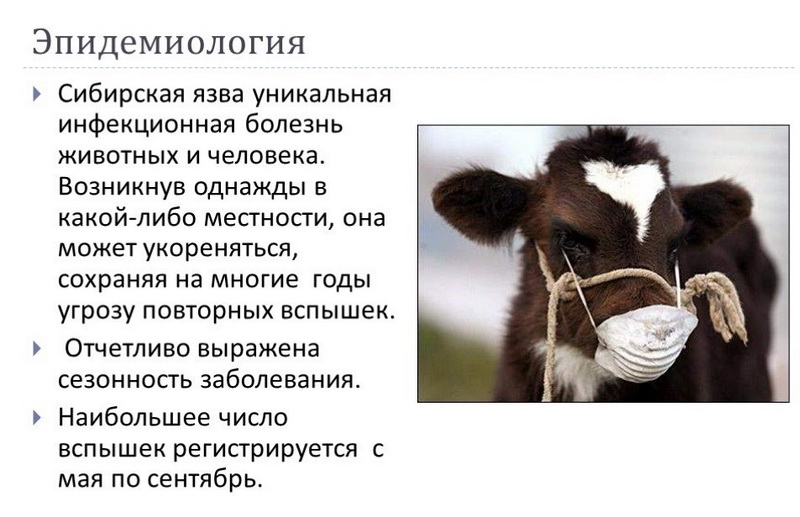 Сибирская язва является острым, особо опасным инфекционным заболеванием, возникающим у человека и животных при заражении Bacillus anthracis, протекающим с формированием на коже специфических карбункулов, либо в септической форме. Заражение животных происходит при употреблении пищи или воды, содержащих споры сибирской язвы, либо при укусах насекомых, переносящих возбудителя от больных животных, зараженных трупов, загрязненных спорами объектов. Особую опасность представляют сохраняющиеся в почве споры, формирующие эпидемический очаг, который может быть затронут при проведении строительных, гидромелиоративных, геофизических и других работ, в результате чего споры сибирской язвы выходят на поверхность и могут заражать животных и человека.