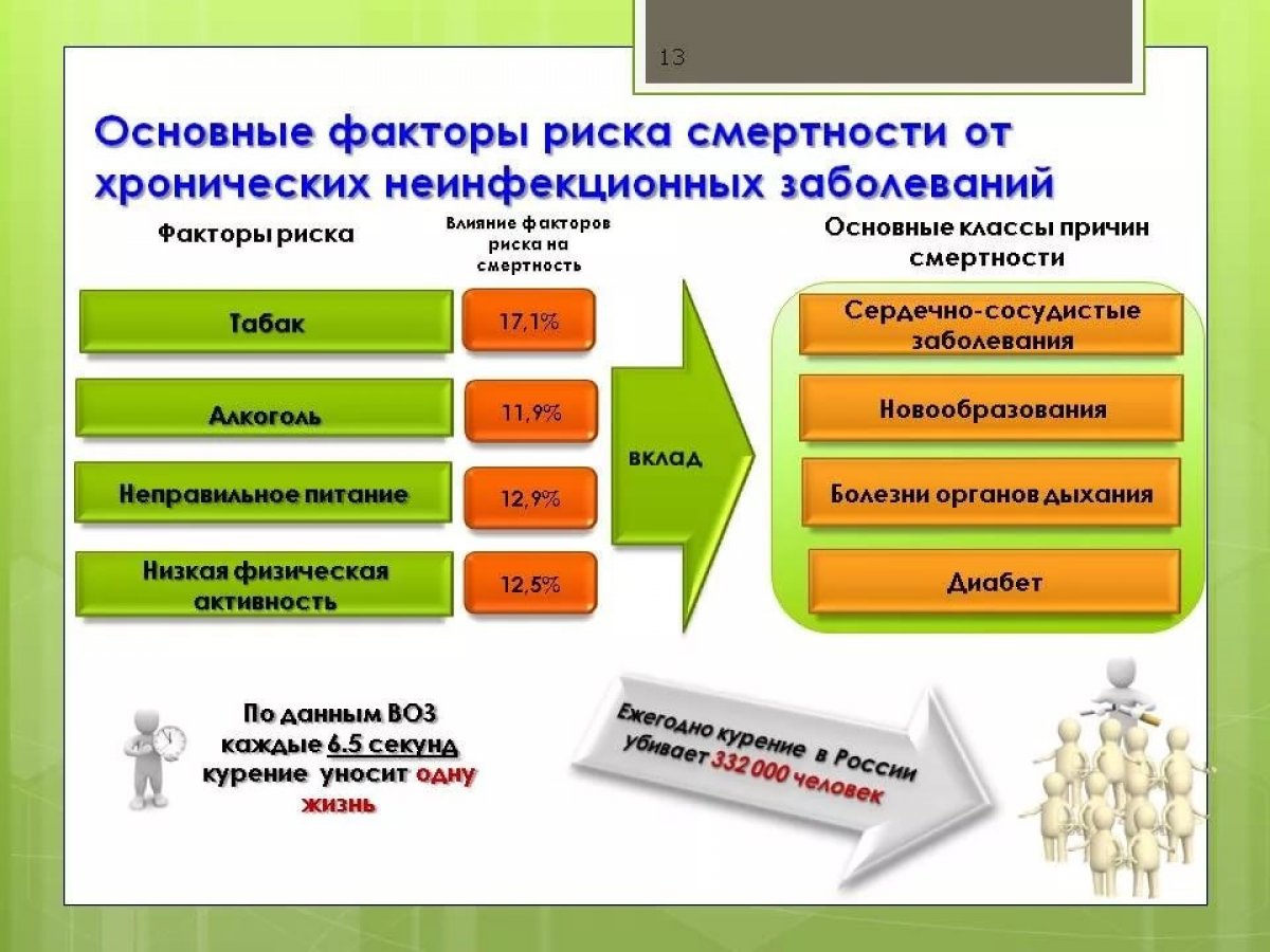 ХНИЗ — это болезни, характеризующиеся продолжительным течением и являющиеся результатом воздействия комбинации генетических, физиологических, экологических и поведенческих факторов. К основным типам ХНИЗ относятся болезни системы кровообращения, злокачественные новообразования, болезни органов дыхания и сахарный диабет.