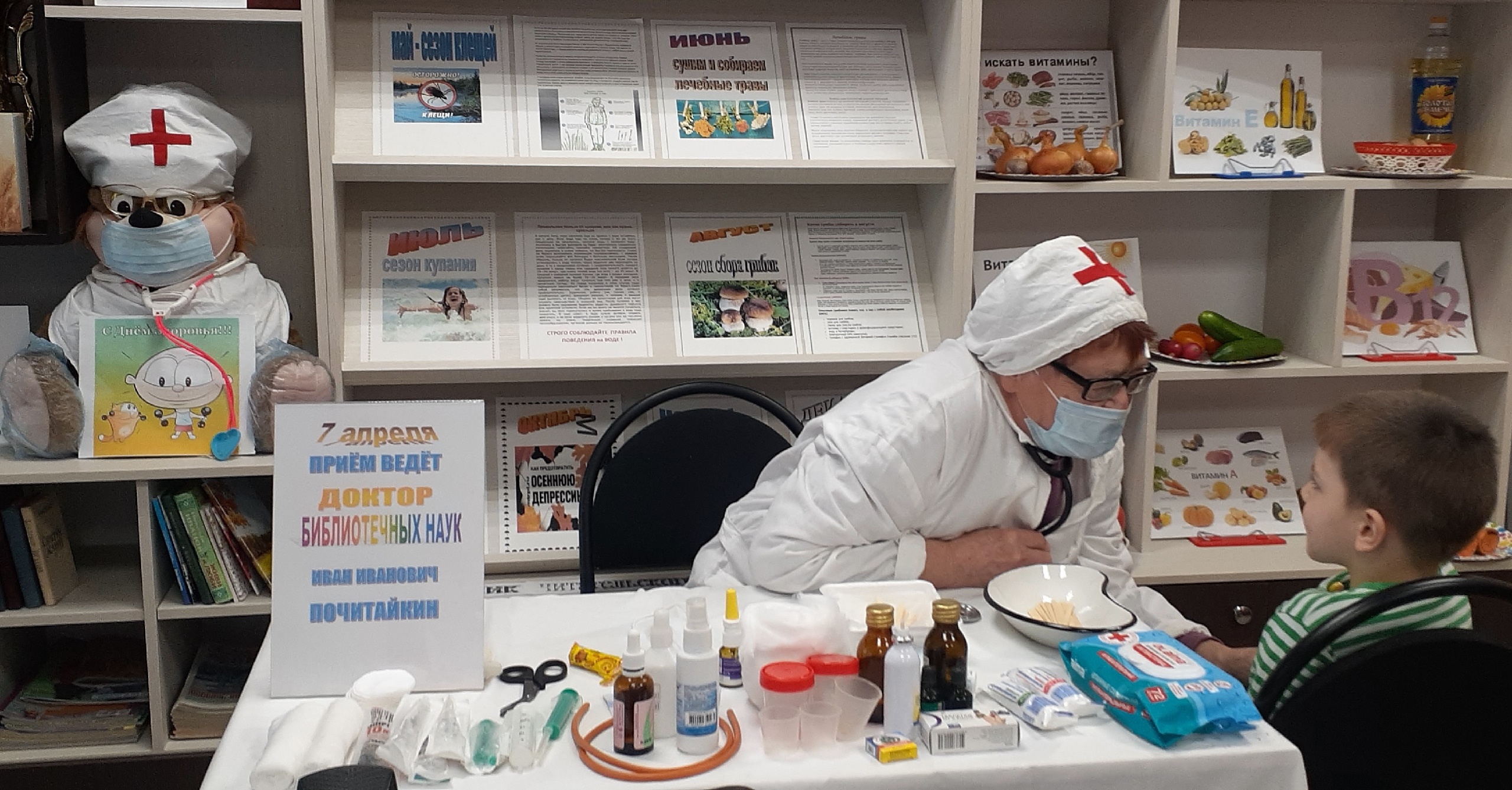 Много мероприятий ко Всемирному дню здоровья состоялось и в библиотеках Ивановского района. Например, в балахонковской 7 апреля прием вел доктор библиотечных наук Иван Иванович Почитайкин. Он провел осмотр юных читателей, а маленькие помощники врача оказывали гостям праздника помощь. Все условные болезни в этот день вылечили.