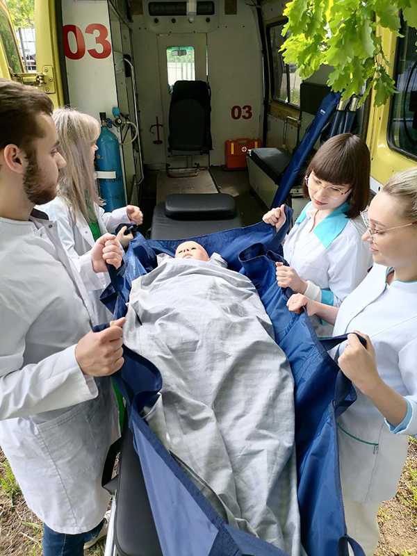 Подходят к завершению занятия для студентов выпускных курсов по специальности «Лечебное дело» по транспортировке пациента в машину и из машины скорой медицинской помощи. Отработанный навык позволит молодым специалистам уверенней чувствовать себя в практической деятельности.
