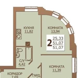 - Общая площадь: 51.1 м²