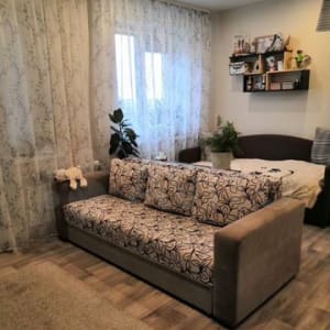 Студия светлая, очень теплая, выполнен хороший дорогой ремонт, делали для себя, имеется утепленная лоджия с панорамными окнами и подогревом пола, оформлена как изолированная спальня. Сан.узел совмещен, в плитке. В квартире остается большинство мебели и техника(холодильник и стиральная машинка). Этаж 14/15, общая площадь 31кв.м без учёта лоджии.